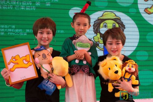 双胞胎1n1姐妹、晶晶与第二届参展企业吉祥物合影