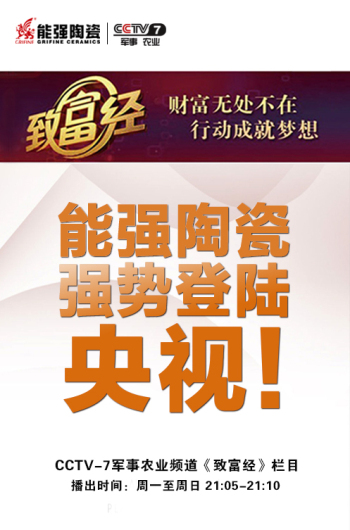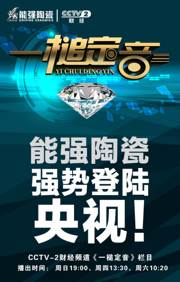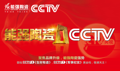 为进一步加大宣传力度、扩大品牌知名度,力争让千家万户用上能强好瓷砖,2017年,能强陶瓷斥资数百万推行品牌战略升级,正式与中央电视台签订品牌合作战略,将于2017年1月9号起强势登陆CCTV2《生财有道》、《一槌定音》,CCTV7《致富经》、《美丽中国乡村行》等黄金节目,敬请关注。