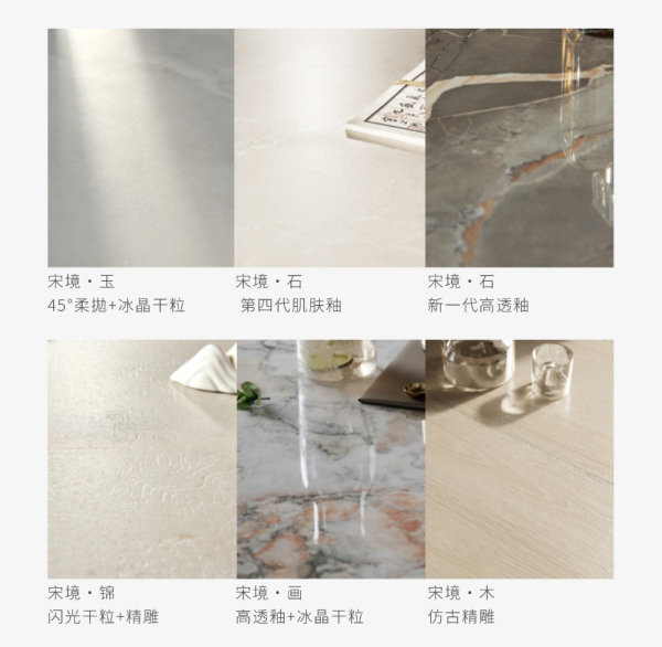 工艺之美:宋境系列拥有45°柔抛、肌肤釉、高透釉、闪光精雕、冰晶干粒、仿古精雕等等6大工艺,可打造与砖面纹理相匹配砖面肌理效果,为消费者提供多样的选择。