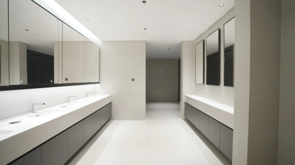 在办公楼的卫生间区域,冠珠仿古砖系列以其致密表面易于清洁的特性,适配公共空间高频使用的需求,确保了功能与美学的统一。