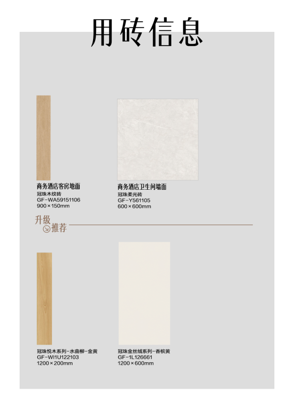 冠珠瓷砖以人性化设计理念为这些商务空间注入温暖与质感——仿古木纹砖以自然暖棕色调营造出温馨宜人的休憩氛围。而柔光砖则在卫生空间中展现出纯净细腻的质感。二者相得益彰,共同打造出舒适得体的商务接待环境,让来自世界各地的宾客感受到科技之外的人文关怀。