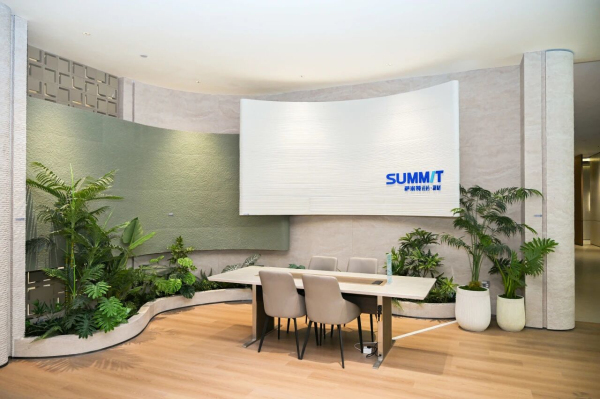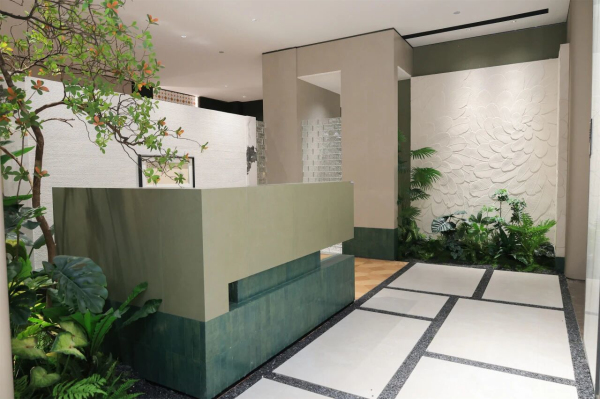 今年10月份,萨米特焕新亮相的5000㎡佛山总部展厅,全面展示了在瓷砖与岩板领域的优势产品。李总透露,展厅从设计、施工到最终交付仅耗时两个半月,关键之一在于全场景应用了新明珠绿材的30多种绿色新材料,极大提升了装修效率。