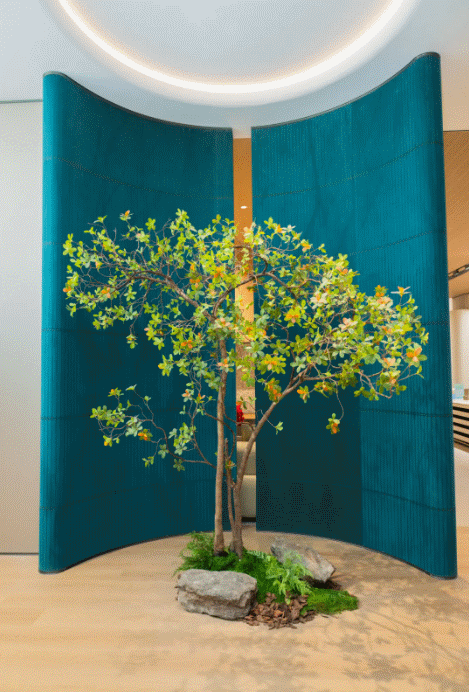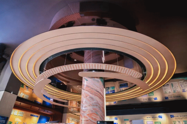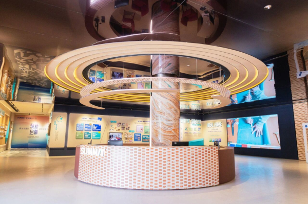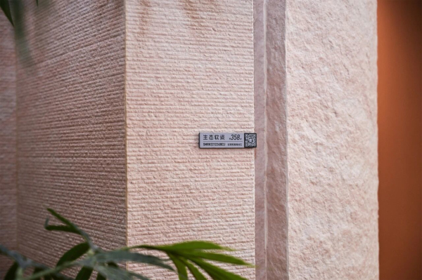 例如,在展厅入口大堂,前台立面、前台环绕的圆柱体包覆材料,以及天花板呈现镜面效果的材料,均来自新明珠绿材。这些产品凸显出新明珠绿材轻薄、随物赋形、应用范围广等优势。