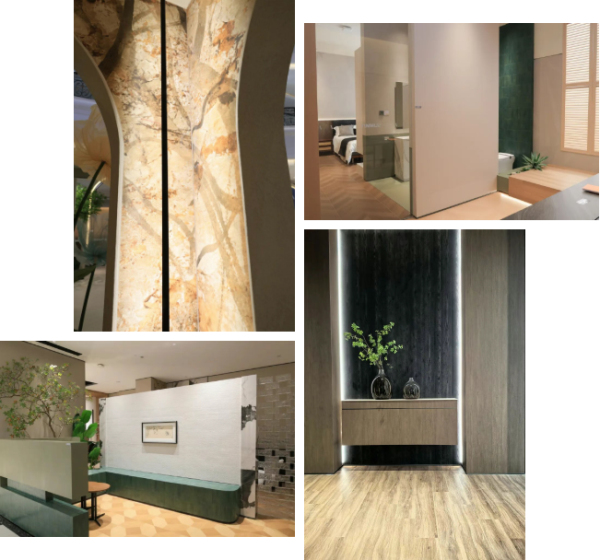 在萨米特新展厅中,新明珠绿材的绿色产品展现出极强的兼容性。墙板产品表面有木纹、布纹、石纹、水泥、金属、马赛克、丝绒和镜面等多种材质的表现,折弯圆弧等工艺简单实现空间造型。软瓷也通过不同的工艺技术,实现饰面材料的更多元可能。