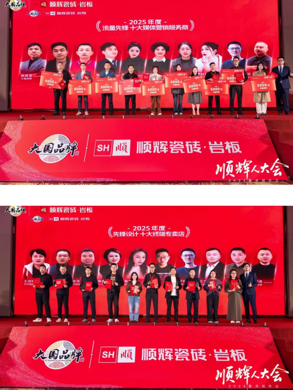 品牌的发展,离不开每一位顺辉家人的辛勤付出。为了表彰年度表现杰出的顺辉家人,会议依次颁发了“2025年度流量先锋 十大媒体营销服务商”“2025年度先锋设计 十大终端专卖店”以及分级经销商等奖项,并压轴揭晓年度“十大风云人物”。他们以卓越的市场业绩与品牌忠诚,为全体顺辉家人树立了学习的标杆。这份沉甸甸的荣誉,是对他们奋斗成果的最高致敬。