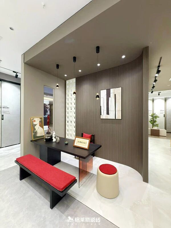 门店设计的灵感来源于“水城”的流动感,结合现代极简美学,让瓷砖产品本身成为空间的主角,打造如艺术画廊般精致、又独具居家温馨感的体验空间。