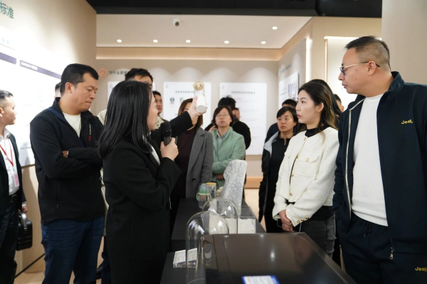 随后,考察团参观新明珠绿材展厅,重点调研了新明珠在绿色产品研发与环保建材推广方面的最新进展。双方就绿色建材在现代建筑工程中的应用性能、低碳标准及环保价值进行了现场交流,深入探讨了提升建筑产业链绿色化水平的有效路径。