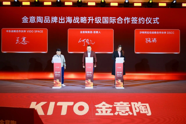 金意陶不仅向内夯实根基,更向外擘画了全球化发展新蓝图。会上,金意陶集团董事长何乾与阿联酋战略合作伙伴 VIDO SPACE CEO王骞、沙特阿拉伯战略合作伙伴 DSCC CEO路璐正式签署战略合作协议。在国内国际双循环的新发展格局下,金意陶正以领军者之姿,参与全球产业链的竞争,进一步提升国际竞争力,推动陶瓷行业的创新发展。
