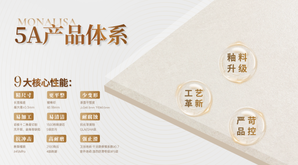 蒙娜丽莎“5A”产品体系覆盖室内用陶瓷地砖、室内用陶瓷墙砖、室外用陶瓷地砖、室外用陶瓷墙砖及陶瓷岩板全类别,打造5A全空间品质生态。