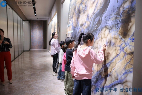 活动伊始,亲子岩板画环节成为了全场最温暖的注脚。家长握着孩子的手,笔尖在细腻温润的岩板表面游走,色彩肆意流淌,奇思妙想瞬间定格。这不仅是一场跨界美学演绎,更是艺术岩板作为新明珠“建筑饰面系统解决方案提供商”战略下,多元场景应用的生动展现。