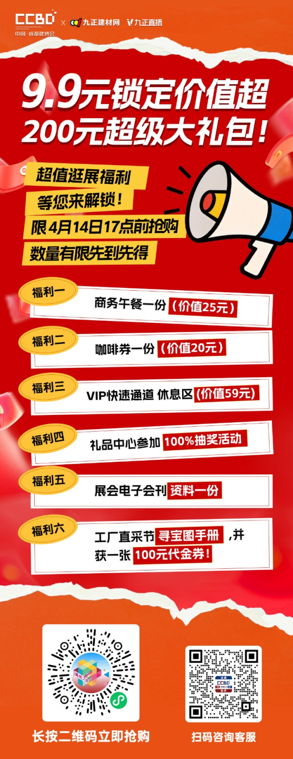 展会专门打造数字化平台【CCBD建装星】,构建“线上+线下”融合的行业新生态。针对专业观众,更首次推出9.9元锁定7项VIP权益的专属福利,尊享价值超200元的超级大礼包!