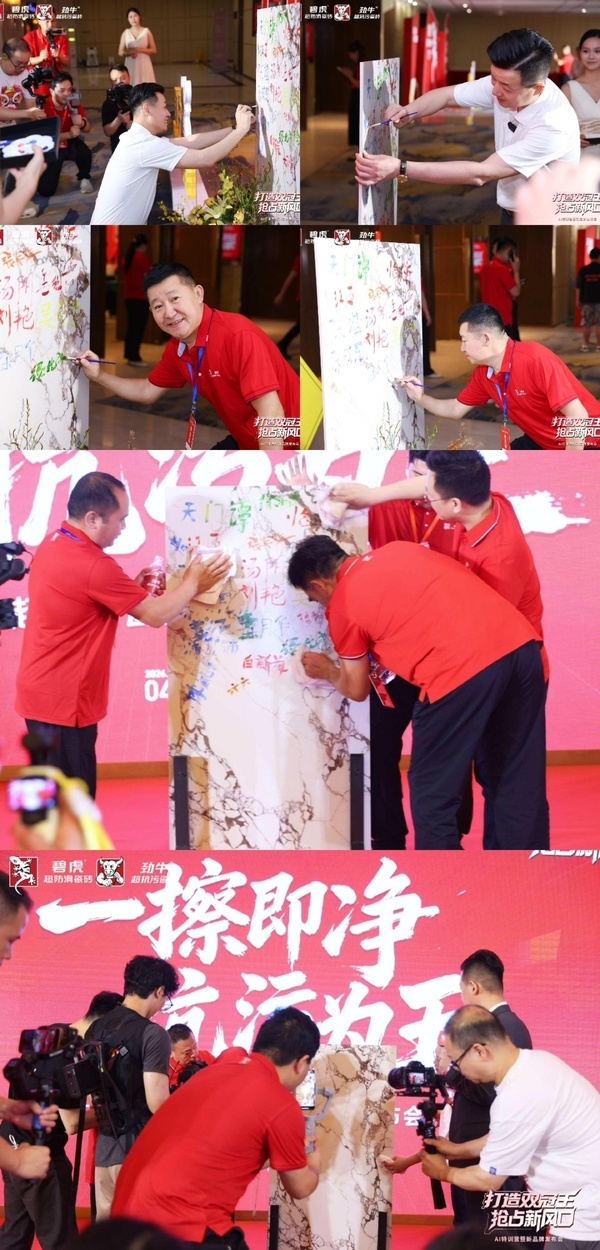 启动仪式结束后,迎来了本次发布会最具说服力的环节——现场实力亲测。本次发布会打破“先讲后验”模式,将产品体验贯穿全程。所有来宾在入场时,就已在签到区的劲牛超抗污瓷砖上用附着力极强的丙烯颜料留下了签名与涂画。工作人员将签名瓷砖搬至舞台,主持人随机邀请嘉宾登台进行清洁挑战。