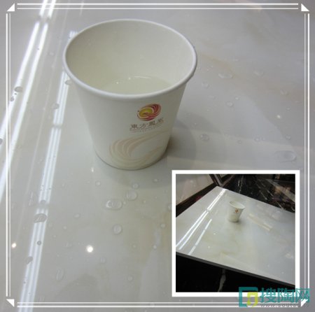 当金刚晶被翻过来时,小编看到这胚底白得很漂亮,品牌logo也十分清晰,不愧是东方凤凰的出品!好了,言归正传,小编在金刚晶背面倒上清水,静待几分钟,圈内的水一点都没有扩散的现象,证明瓷砖不吸水!然后放下纸巾,水分全被纸巾吸掉了,擦干后瓷砖背面依然干燥,吸水率过关!